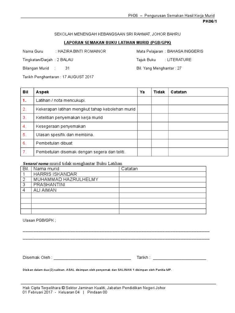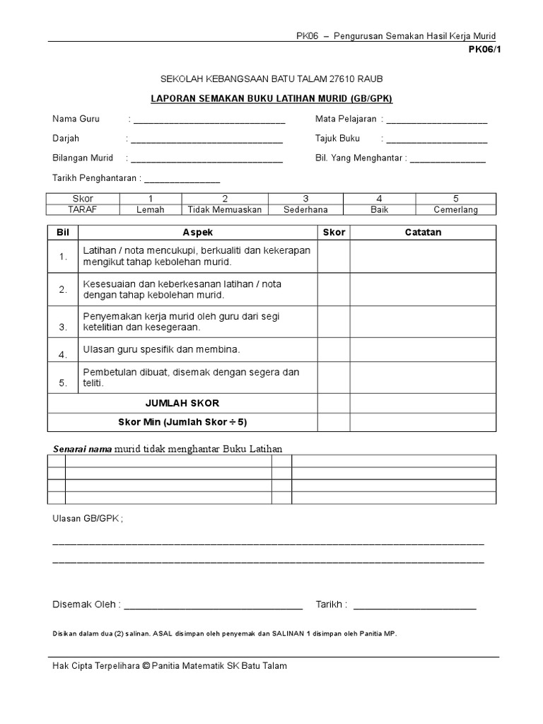 Borang Semakan Buku Kerja Murid Doc Document