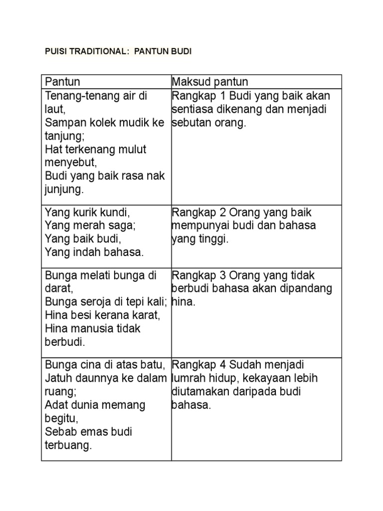 Puisi Tradisional Tingkatan 4 Pantun Empat Kerat Budi Nota Spm Tatapan Minda