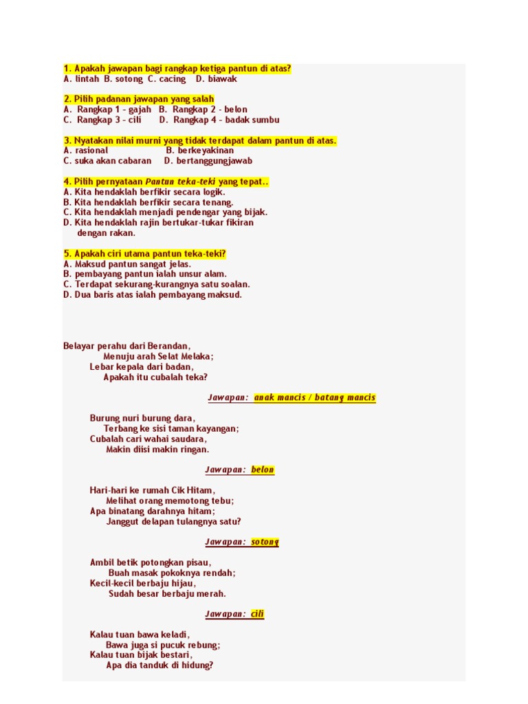 Hilanglah budi bicara akal. Karena teka teki pada hakikatnya soal yang berupa. Pantun teka teki dan jawapan pantun teka teki 4 kerat dan jawapannya. Biasanya terletak pada bagian akhir pantun.