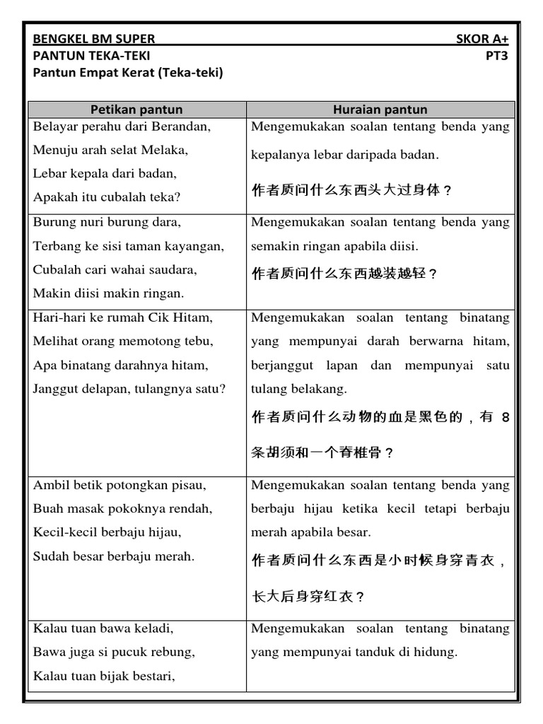Pantun Teka Teki 4 Kerat Dan Jawapan