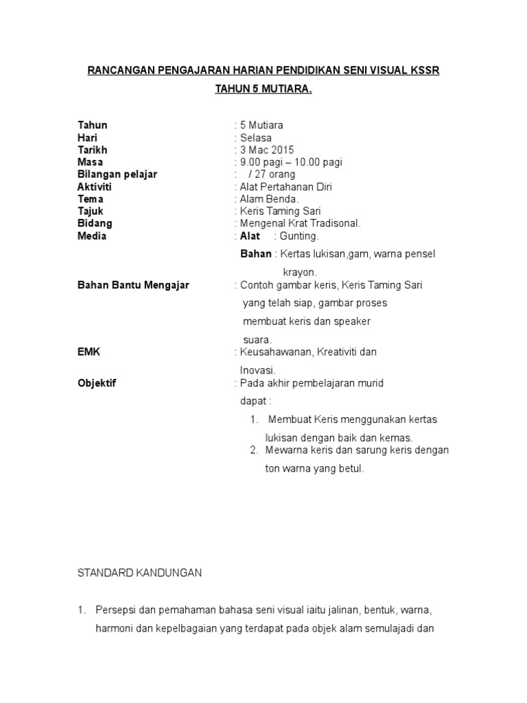 Rancangan Pengajaran Harian Pendidikan Seni Visual Kssr Tahun 5 Mutiara