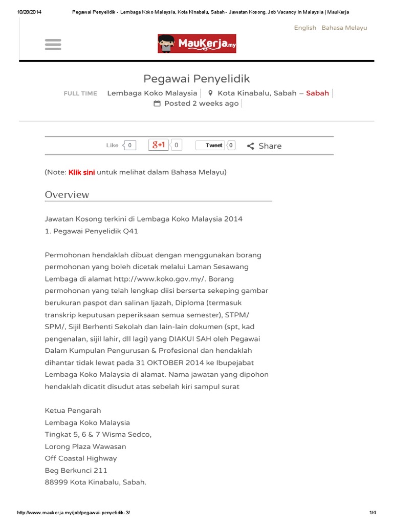 Pegawai Penyelidik Lembaga Koko Malaysia Kota Kinabalu Sabah Jawatan Kosong Job Vacancy In Malaysia Maukerja