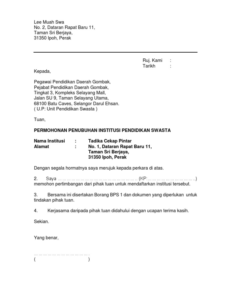 5 Contoh Surat Permohonan Tadika Doc