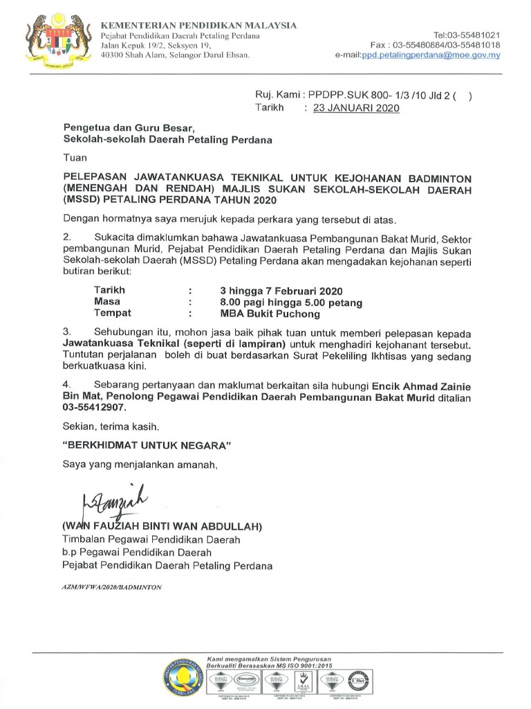 Contoh Surat Pelepasan Jawatankuasa Teknikal Untuk Kejohanan Badminton 2020