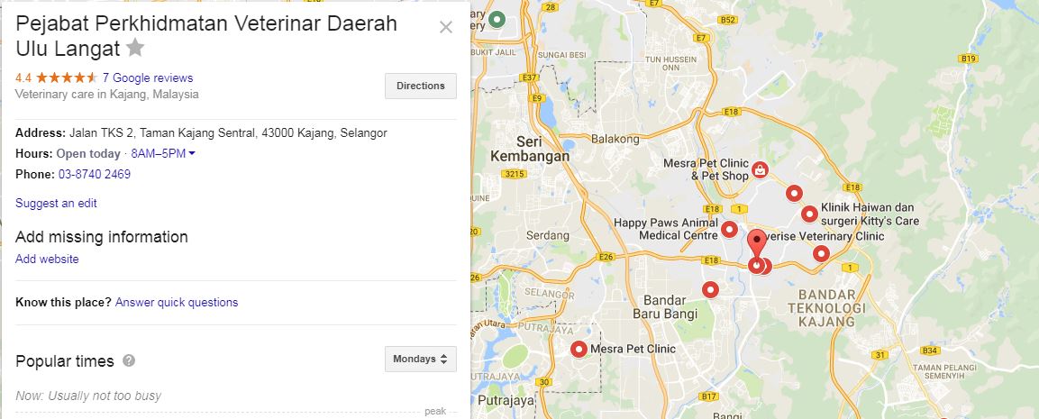 Specialize in animal surgery stranded animal and injured animal. Pejabat perkhidmatan veterinar daerah hulu langat is a veterinary clinic based in kajang selangor. Get their location and phone number here. Rumah cik halim n cik esah 102m.