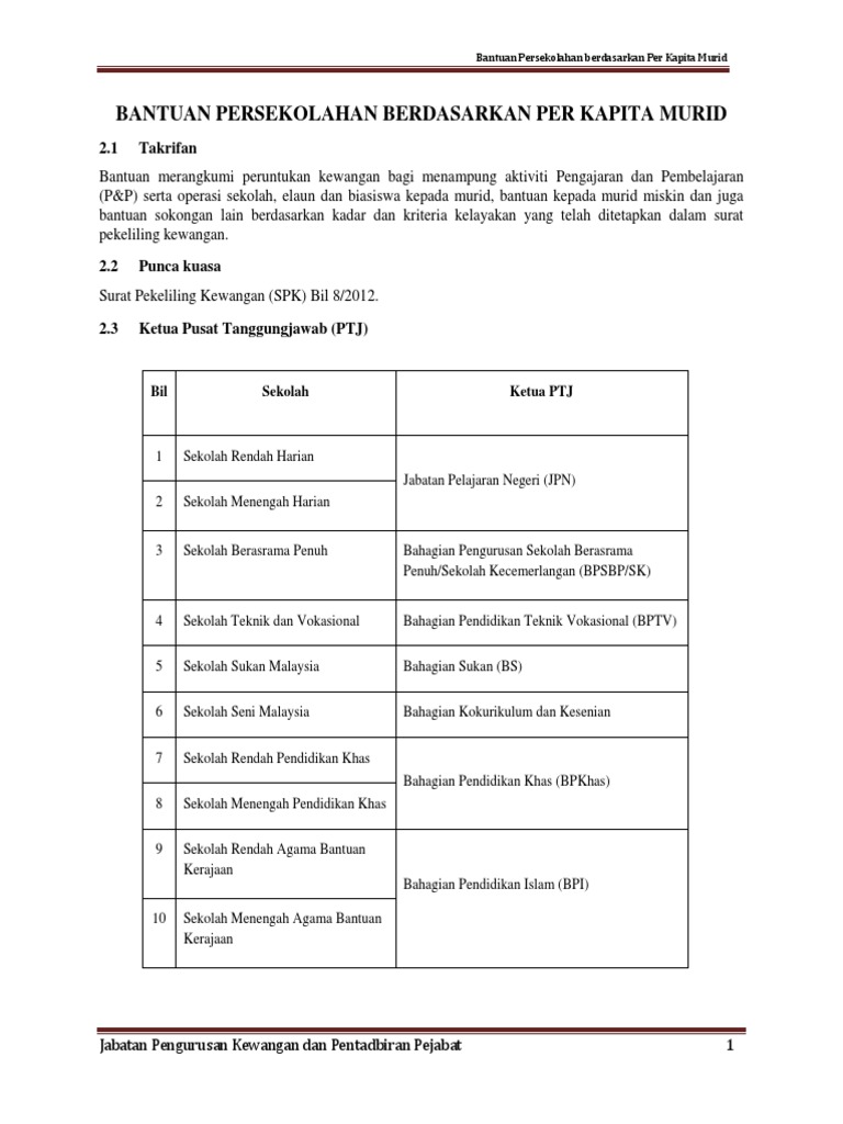 Surat Pekeliling Kewangan Bilangan 8 Tahun 2 Kandungan Pendahuluan 3 Bab A Jenis Kadar Dan Maksud Belanja Bantuan Persekolahan 6 I Bantuan Geran Per Kapita Pcg 7 Ii Yuran Khas Sekolah Yks 32