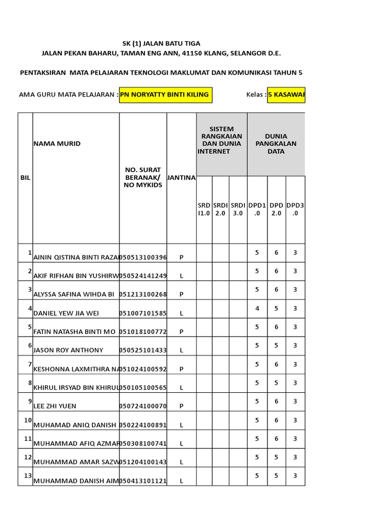 Templat Pelaporan Pentaksiran Sekolah Bagi Setiap Mata Pelajaran Kssr Semakan 2017 Tahun 1