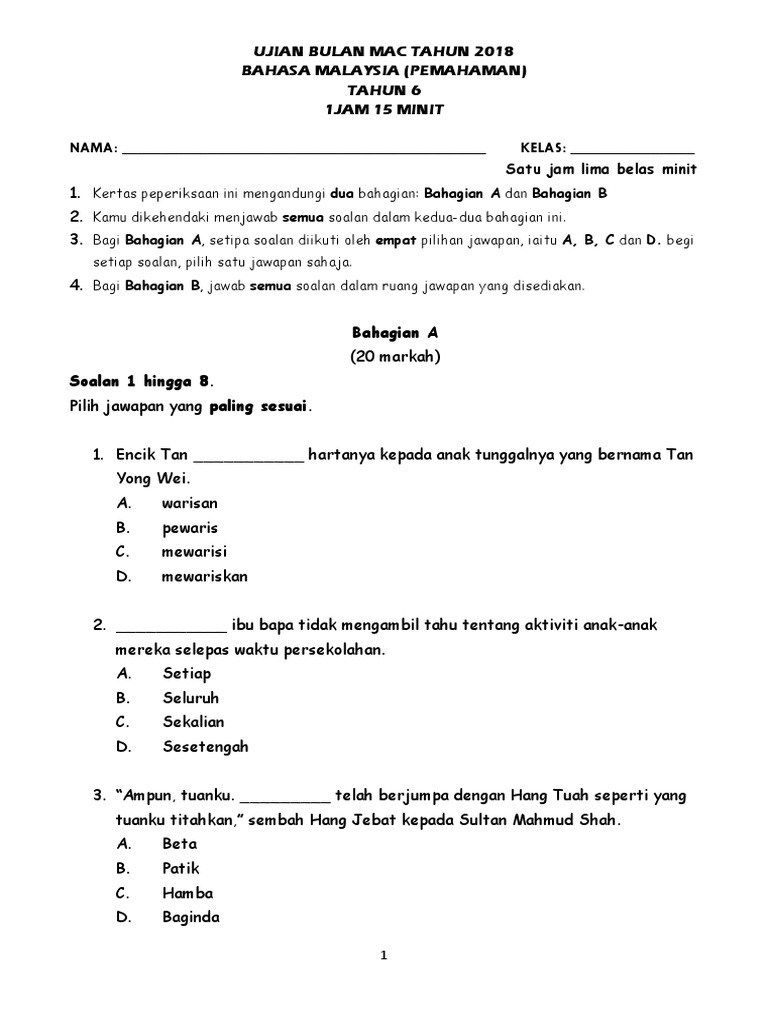 Contoh Soalan Bahasa Melayu Tahun 1 2018 Sukoharjo Dd