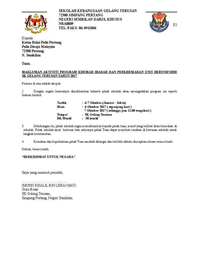 Surat Rasmi Contoh Surat Makluman Kepada Polis