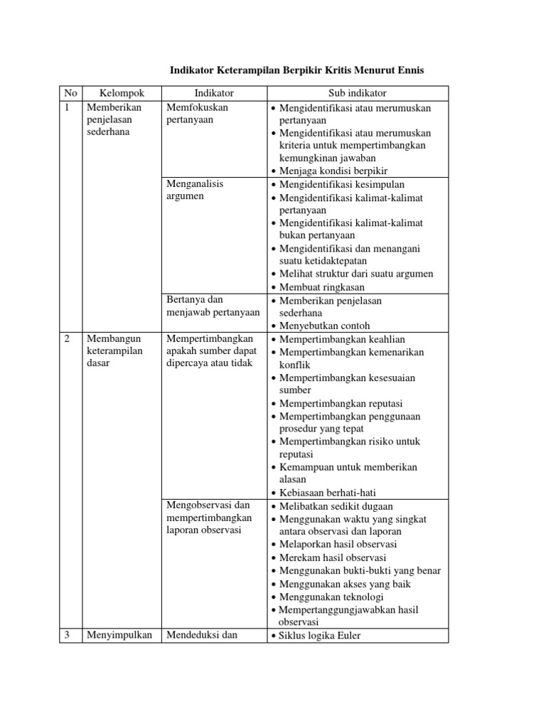 Berpikir Kritis Pengertian Teknik Model Aspek Tabel