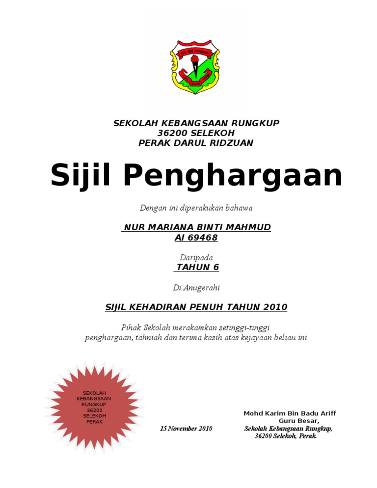 Dengan ini disahkan bahawa. Sijil penghargaan dengan ini disahkan bahawa nur athirah binti mohd suhaimi 960000 00 0001 menerima anugerah pelajar terbaik kurikulum aliran sains agama sempena majlis graduasi 2013 puan juariah binti yunus pengetua smka tun perak 77000 jasin melaka. Sekolah menengah kebangsaan agama tun perak 77000 jasin melaka.