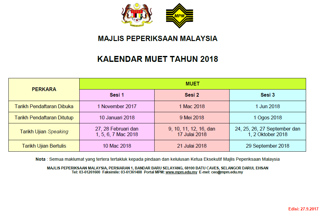 Kalendar Peperiksaan Muet 2018 Pendidikan Malaysia