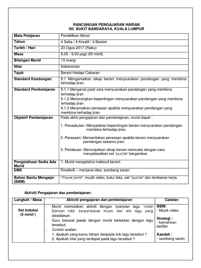Doc Rancangan Pengajaran Harian Pendidikan Moral Tahun 5 Mem Mm Academia Edu