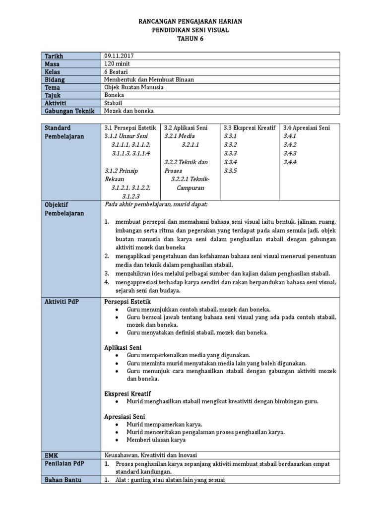 Rph Pendidikan Seni Visual Tahun 6 Sumber Pendidikan
