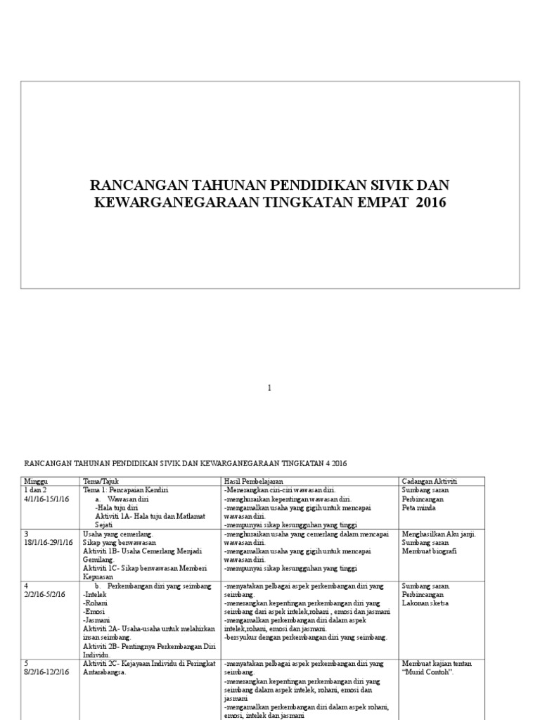 Rancangan Tahunan Pendidikan Sivik Dan Kewarganegaraan Tingkatan Satu