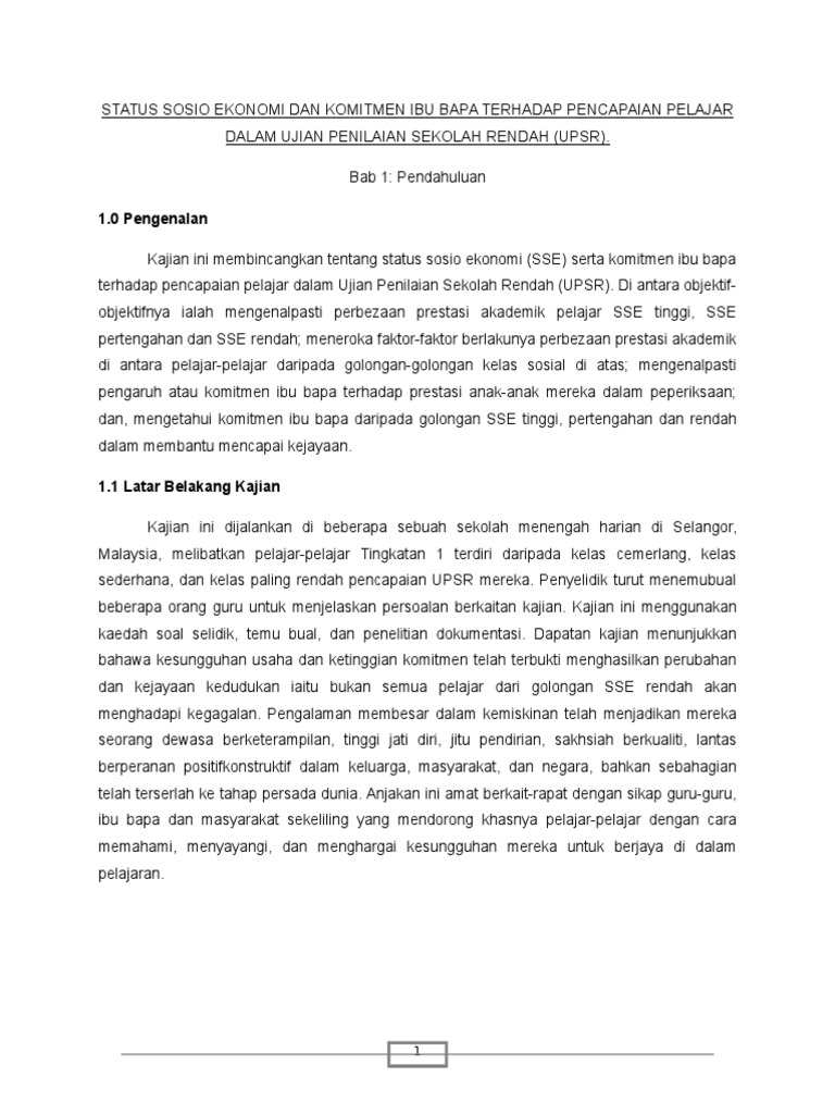 Status Sosio Ekonomi Dan Komitmen Ibu Bapa Terhadap Pencapaian Pelajar Dalam Ujian Penilaian Sekolah Rendah