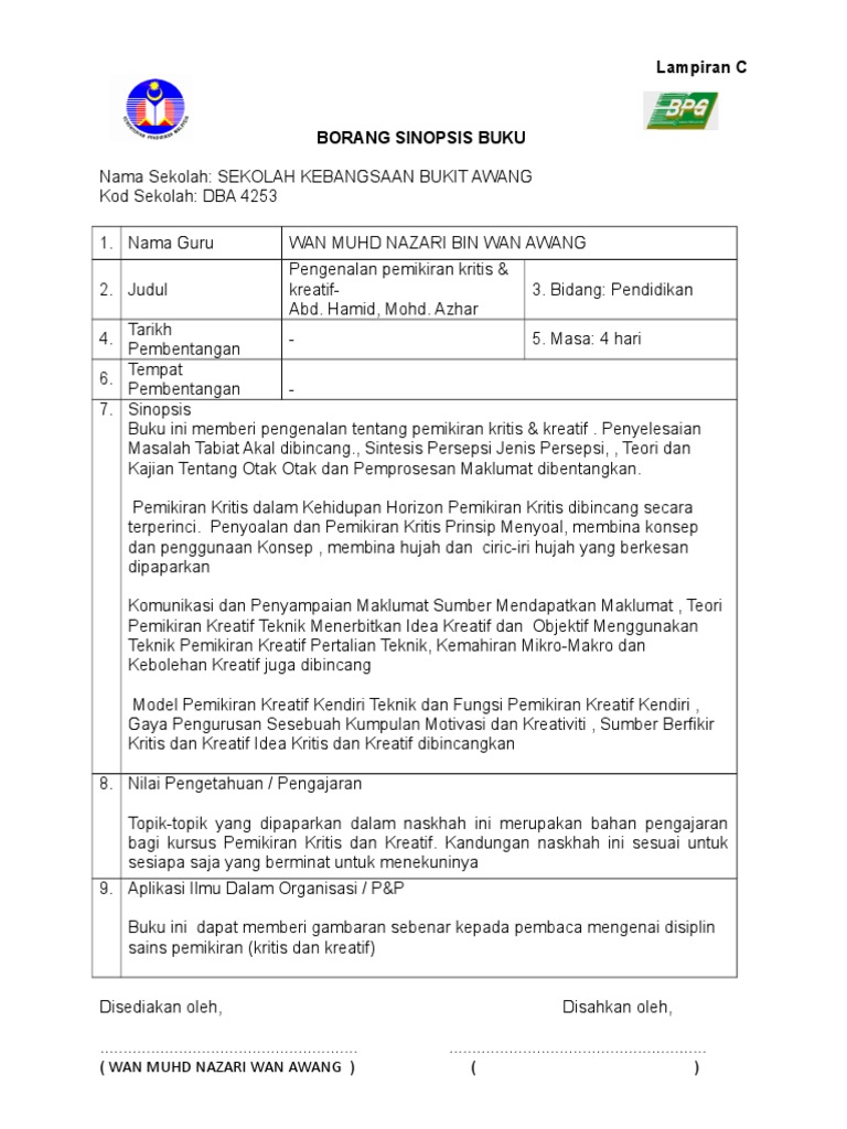 Borang Sinopsis Buku Pengenalan Pemikiran Kritis Dan Kreatif Mohd Azhar Abd Hamid 444 Ms