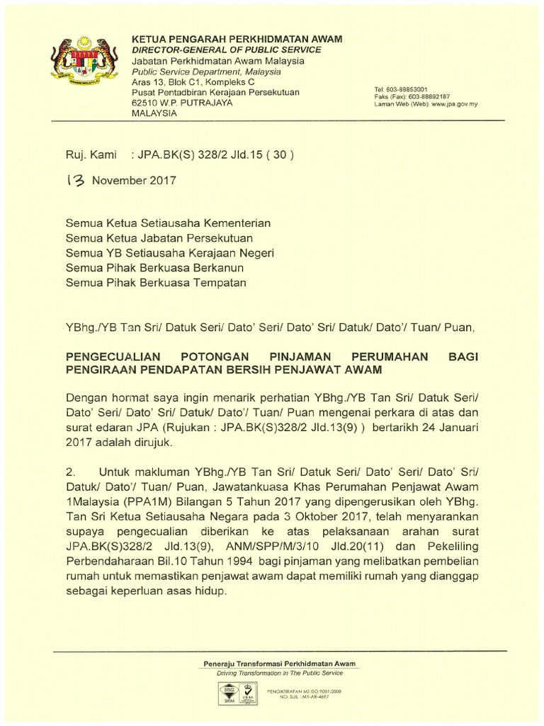 Pekeliling Pengecualian Potongan Pinjaman Perumahan Bagi Pengiraan Pendapatan Bersih Penjawat Awam