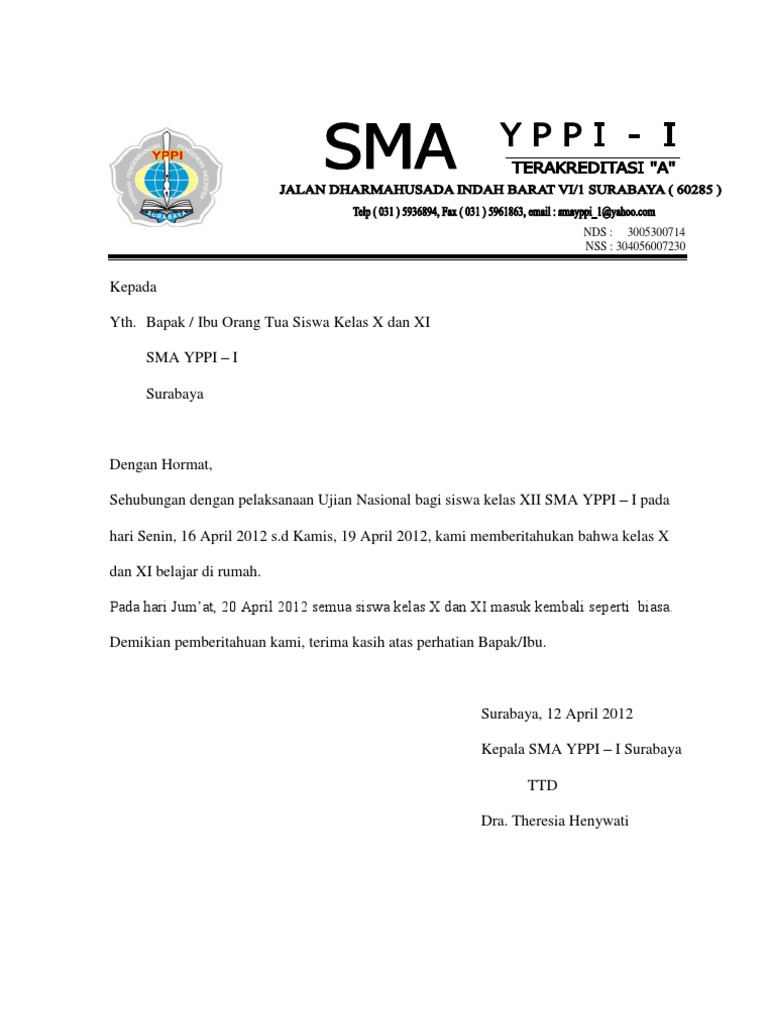 Contoh Surat Pemberitahuan Pembayaran Sekolah Untuk Wali Murid Suratkerja Com