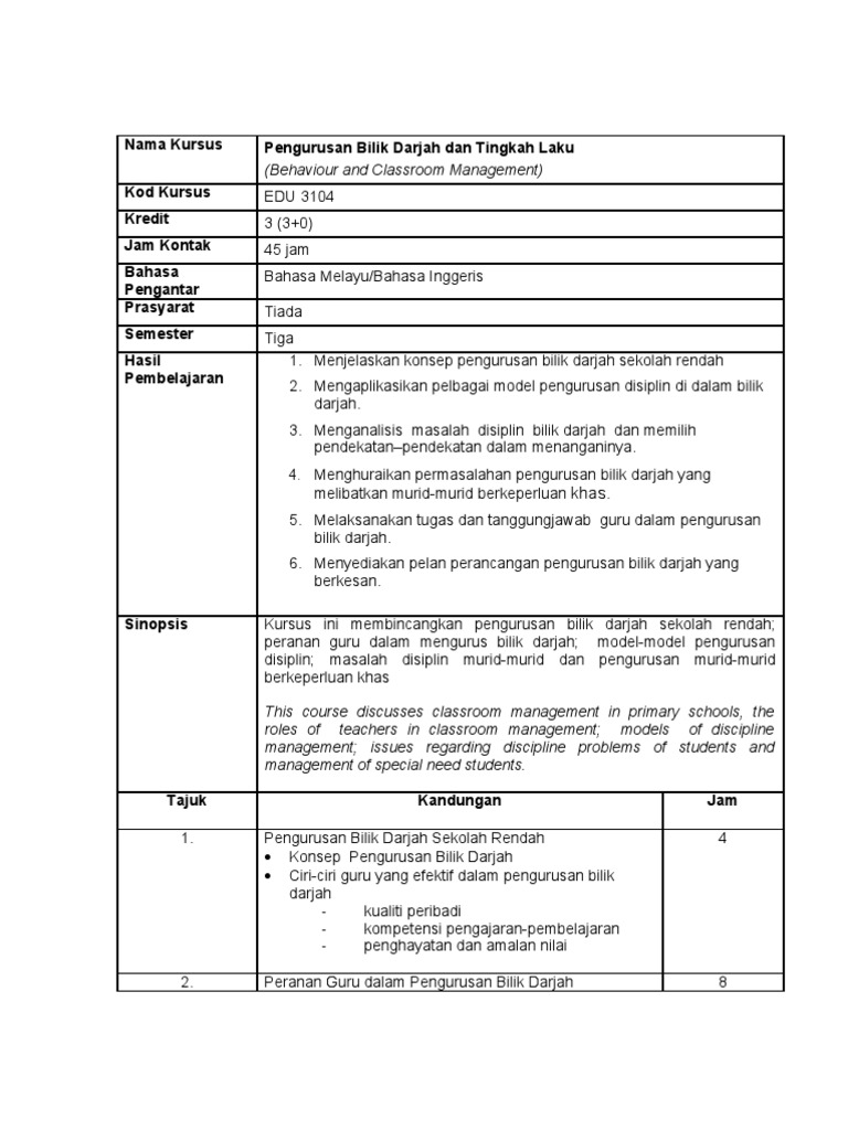 Nama Kursus Pengurusan Bilik Darjah Dan Tingkah Laku Kod Kursus Kredit Jam Kontak Bahasa Pengantar Prasyarat Semester Hasil Pembelajaran