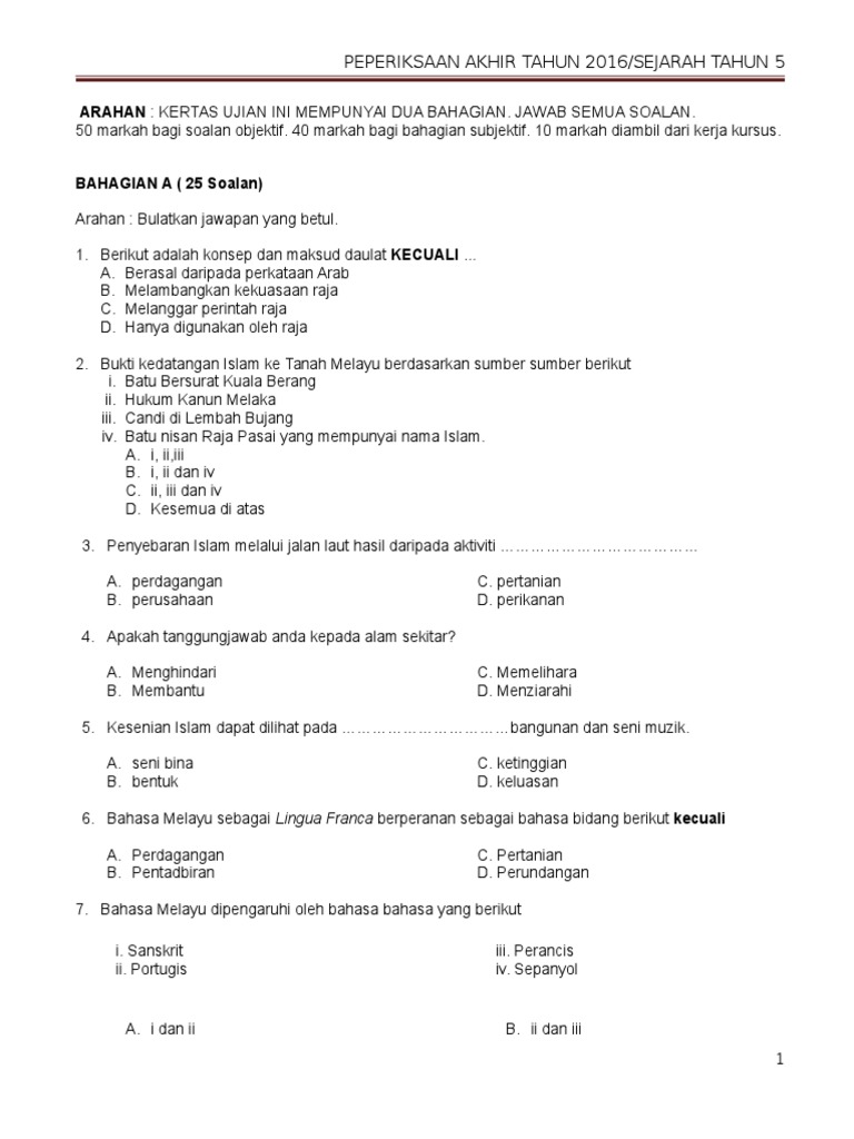 Untuk pengumuman kepada semua tiada satupun contoh soalan peperiksaan akhir tahun pendidikan islam tahun 5 yang kami berikan ini hasil dari kami sebaliknya kami sebagai medium perantara yang menyediakan tempat himpunan bahan bahan sahaja untuk memudahkan para guru mendapatkannya. Sejarah tahun 5 penilaian pertengahan tahun 2015 c. Sebelum bermula cuti sekolah murid perlu melalui ujian peperiksaan terakhir iaitu peperiksaan akhir tahun yang menilai apa yang telah dipelajari oleh murid sepanjang setahun berada di sekolah. Pentadbiran negeri melayu bersekutu diketuai oleh seorang a.