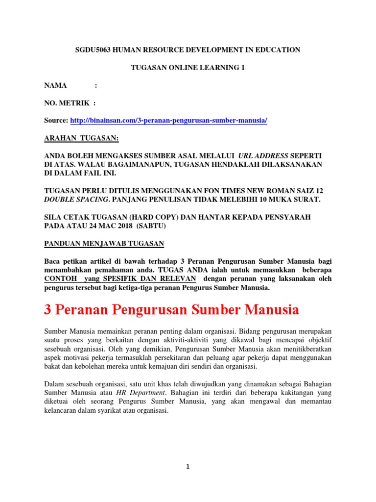 Online Learning 1 Peranan Pengurusan Sumber Manusia 1