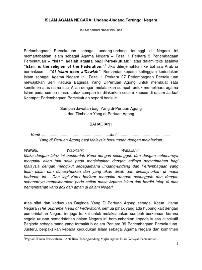 Islam Agama Negara Undang Undang Tertinggi Negara Haji Mahamad Naser Bin Disa
