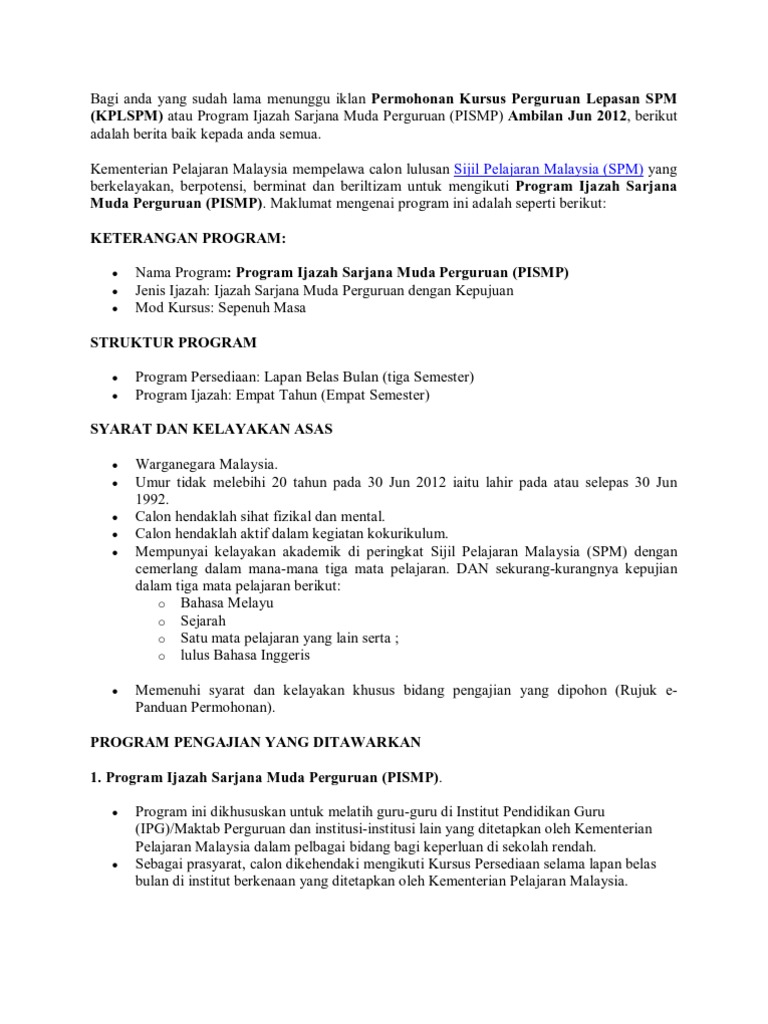 Que Achmad Dot Com Permohonan Maktab Perguruan Lepasan Spm Juga Dikenali Sebagai Kplspm