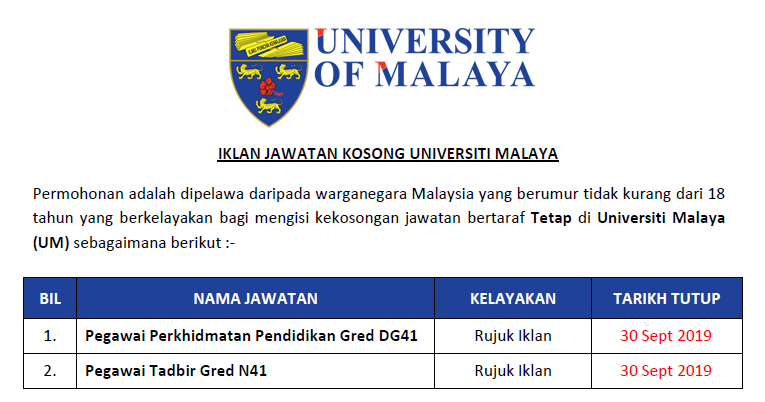 Jawatan Kosong Universiti Malaya Um Tarikh Tutup 16 Jun 2019