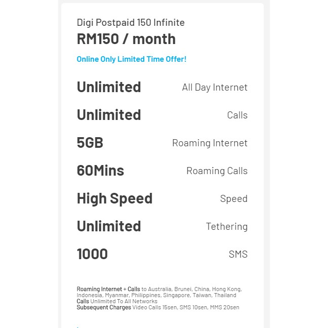 Digi Infinite 150 Postpaid Plan Unlimited Data High Speed Internet Tethering Hotspot Call Shopee Malaysia
