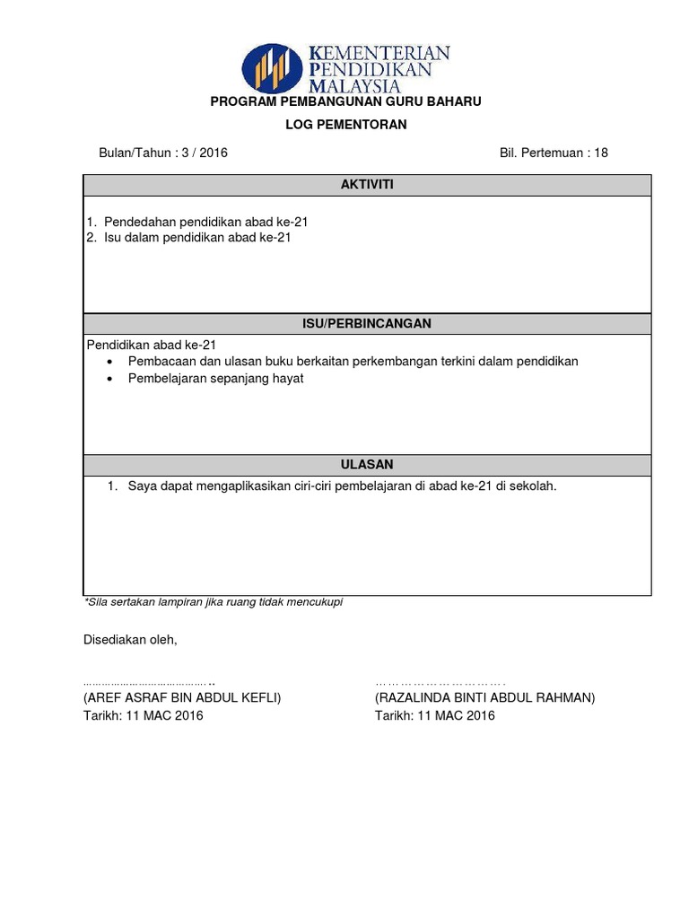 Log Pementoran Program Pembangunan Guru Baharu Minggu 18