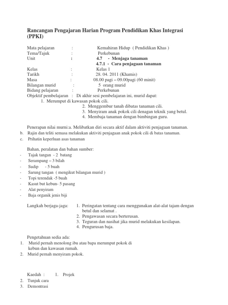 Rancangan Pengajaran Harian Program Pendidikan Khas Integrasi